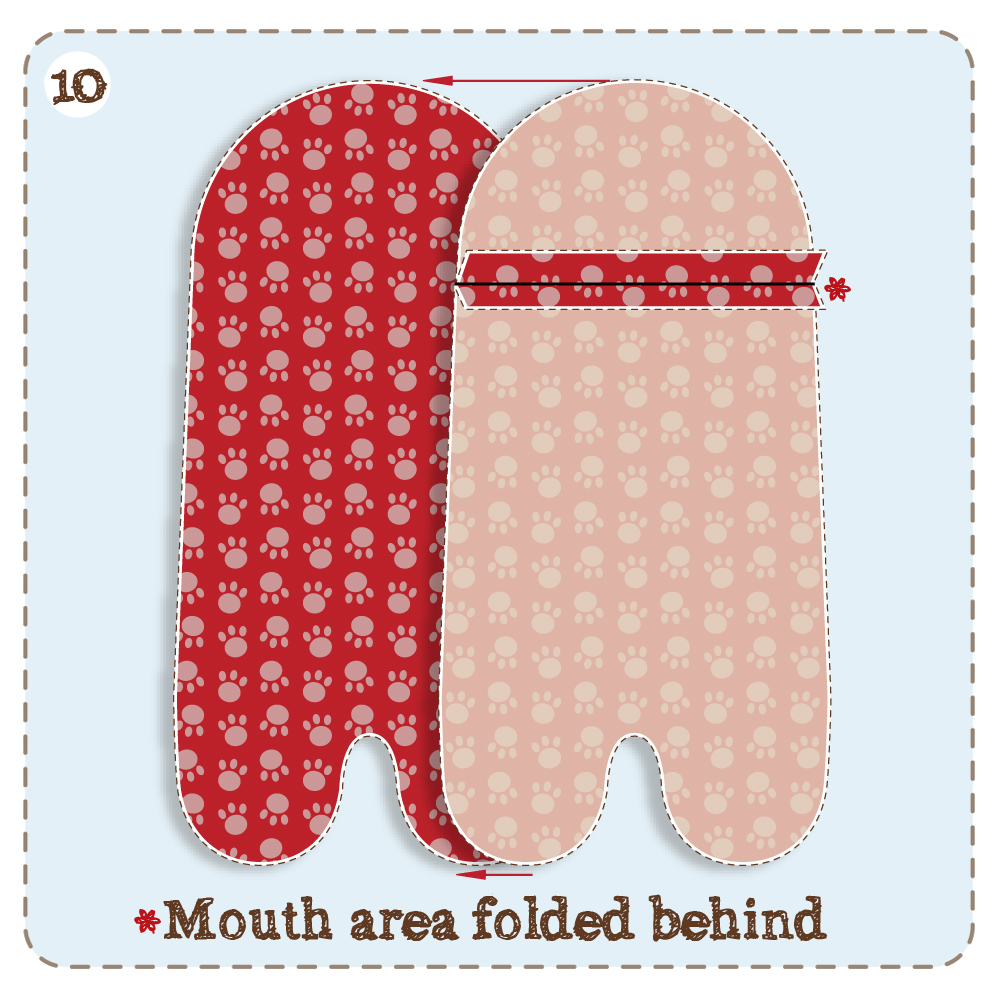 10/ Next fold the mouth area behind & press flat, then right sides together,