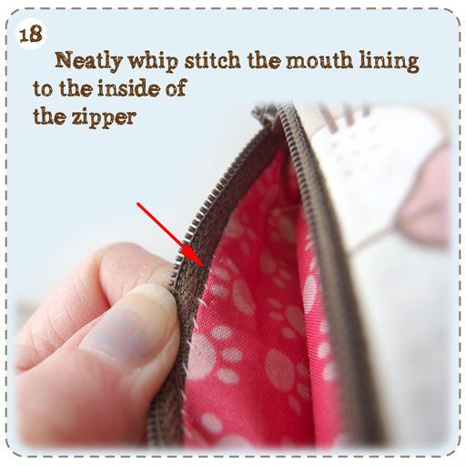 18/ Neatly fold under & hand sew the LINING mouth opening to the inner sides of the Zipper: